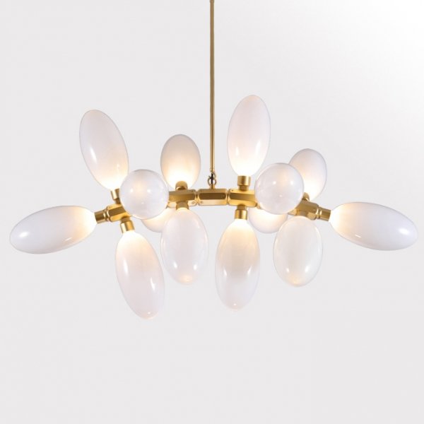 Каждая люстра состоит из большого количества плафонов нанизанных на алюминиевые подвижные позвонки. Что дает возможность видоизменять люстру, давать ей естественное ниспадание. Каждый плафон выдувается вручную - что дает особенное, в полном смысле этого слова, неповторимое,  изящество.